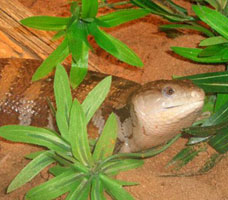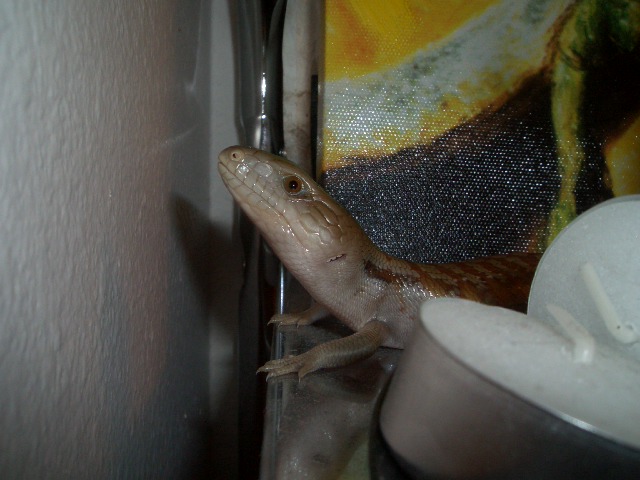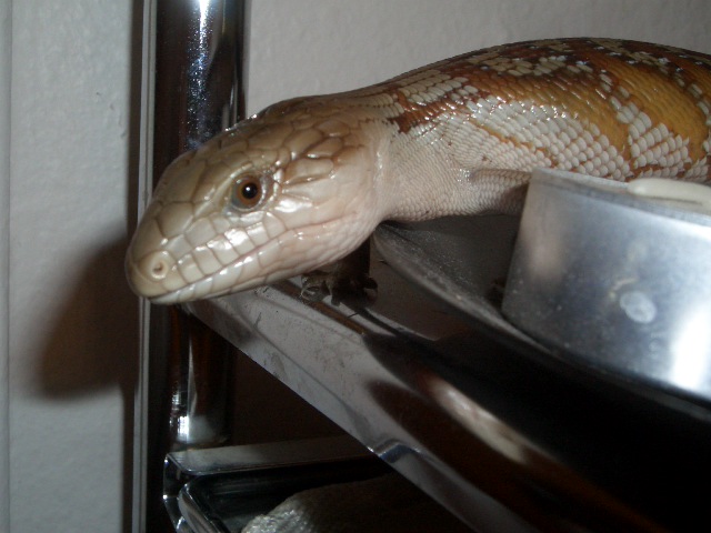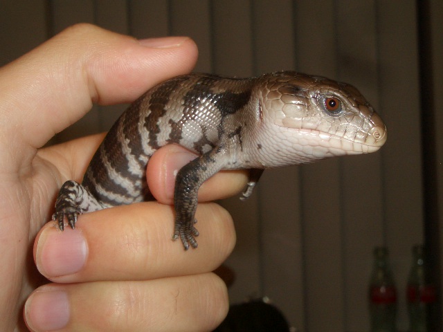 This skink's nickname is Mortimer, or Mort for short. He's tame, very handsome, and seems to be somewhat of a leader skink. When housed together as babies, they tend to sleep together, eat together, and just sort of follow each other around. This one seems to try to find his own way and not follow the pack. We often find him in the corners by himself. Perhaps the other babies don't like him, we don't know, perhaps they are jealous of his smooth swagger and good looks? |