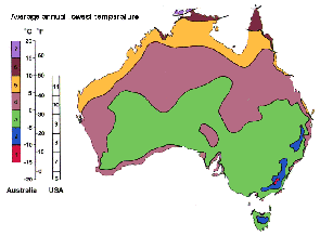 Do not handle your animals during brumation! They do not eat during brumation because they are very cold and therefore cannot properly digest food. If you handle them, they will warm up, become active, and the organs will start working full fledge (the body slows way down during bruamtion). You want them pretty much dormant the entire winter. Some breeders even put their animals in shoe box sized enclosures for the entire winter with no light. Some BTS in Australia would definitely experience this as they would go underground while the entire land is covered in deep snow. One method I use sometimes is to place my entire collection in the garage. The garage is naturally much cooler than the house during winter, and it works perfect. If you use this method, there are no questions or worries on how to cool; simply place them in the garage and you're set. The brumating temperature that works perfect for me is 50 degrees. My max brumating temperature would be probably 55-60, and my minimum would be no lower than 40. While BTS definitely experience temps in the wild colder than 40 degrees, I believe that their shelter typically would provide some warmth, and it also must be understood that not all BTS would survive a cold harsh winter. I'm not into replicating extreme conditions even if it would be accurate. One needs to understand that nature is indeed harsh and that animals do die in nature due to weather. I write this because I've spoken with some hardcore breeders who copy wild conditions to a T. It's just not necessary in my opinion. The colder the temperatures, the longer and harder your BTS will sleep. If you have a particularly warm day, this will increase the temps in the garage and you may see your BTS scurry about for a short while probably to take a quick drink. Even if your heat lamps are left on for 8 hours a day, if it's 40-50 degrees, they will probably not use them. If it warms up outside, the BTS will definitely recognize it, and will likely warm up for a bit under the heat lamp. A brief sun tan is not the same as handling. The sudden stress factor will play a role in the general disruption of your animal's winter sleep. Do your best to disrupt them as little as possible while walking in and out of your garage. Note: This is talked about later, but I strongly believe a nature CD (water, crickets, birds, etc) plays a role—it definitely makes a difference when you compare it to absolute dead silence. BTS are so aware and curious of their surroundings. I believe this includes any sound that they might hear. For fun, here is a chart showing average annual low temperatures in Australia. Click to enlarge.
