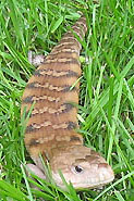 If a bluey starts to go to the bathroom on you—which usually results from an excessively strong grip or a body that is not fully supported—DO NOT PANIC! Many people get very startled, and throw the animal off their lap in a panic. A blue tongue's urine is just water, and has no scent or color. Excrement however, is obviously more odorous, but it's nothing that will stain or hurt you. Remember, it is possible to get your bluey on a feeding schedule, which essentially gets them on a "waste cycle". They normally defecate once per day (unless they have loose stool), and it's probably not a good idea to let them wander around outside their cage until they've done their business. A word of advice: Blue tongues tend to defecate/urinate once they become active. They often hide or sleep in their cages, so once you take them out, excreting their bodily fluids is often the first thing that happens. Just be sure to take them out in the grass for a few minutes, and they usually go right away. If you see waste in their cage upon returning home, you're good to go! Keep in mind that if your BTS has the runs, he could go a number of times during the day, and at any time.