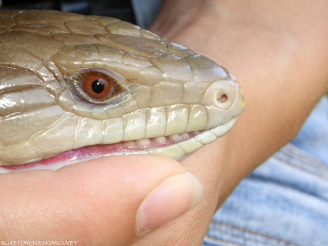 - Large bulky head—There are no set sizes for blue tongued skinks. When it comes to sheer body size, males are not bigger than females, and females are not bigger than males (generally speaking). Naturally, if you have a very large female, she will likely have a very large head. If you have a very small male, he might have a very small head. To top it off, sometimes heads are even disproportionate. If an animal was malnourished during his crucial first year, his growth may have been stunted. This can affect all sizes of the animal. Tail length, body length, head shape/size, etc. The point is, looking at your animal and observing (what you think) is a large head is not accurate because any number of the above mentioned variables could be in affect. All in all, blue tongued skinks come in many shapes and sizes, male or female. Generally however, males do tend to have bulkier heads than females in comparably sized and analogous species, but remember to consider all the variables and remember that nothing is concrete. For example, if you browse some of the pictures on this site I'll bet you can't recognize which are male and which are female based on head shape—Try it!