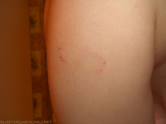 The female that did this is actually the big white Northern, Lissa, from the Northern page. She is unusually very aggressive toward other blue tongues, but not with people. While breeding her to the animal shown here, Alex had to carefully tape her mouth shut so she could not fully open it. As previously mentioned, this may seem cruel, but does not hurt the animal whatsoever, nor is the mouth fully closed—but closed only enough to keep her from being able to bite the male. As you can see, Lissa still succeeded in injuring the male.